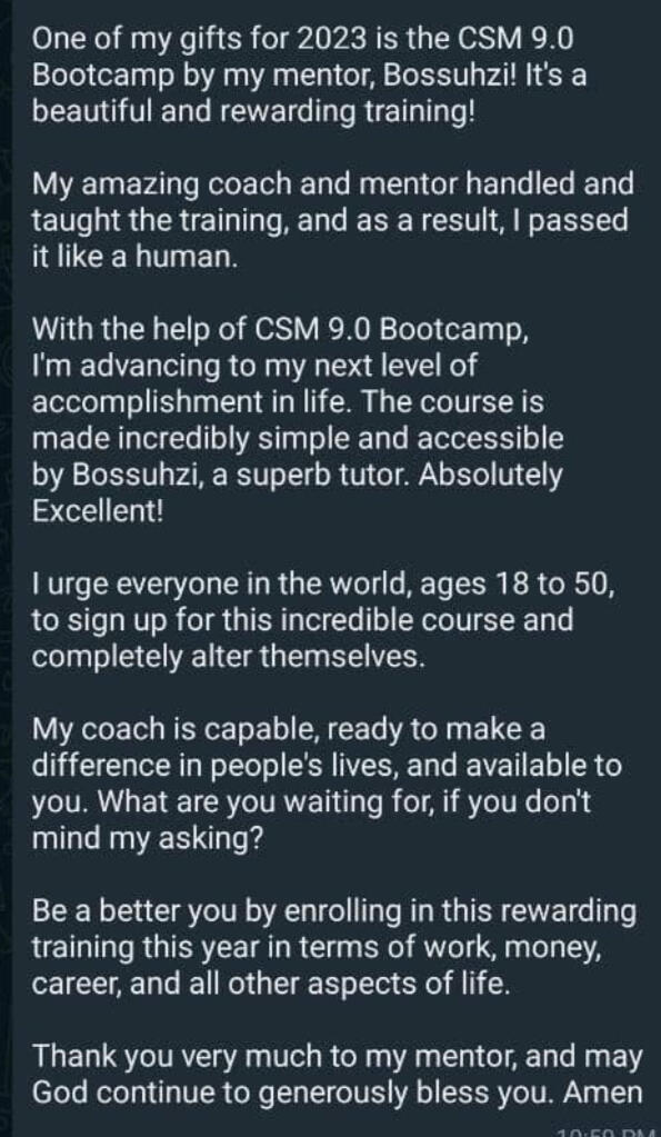 This simply means Salesman in print, your ability to persuade your ideal customer to make a buying decision using unique strategies I will show you.From a total Newbie who had never made any good money online, Copywriting was the vehicle that transported me to the life of my dreams, Right now, I sit in the comfort of my home and just make money.You can apply these skills to sell anything online and get results even if you sell Courses, clothes, bags, shoes, phones, consulting, writing, plumbing, massages services and allAnd the best and highly recommended way to learn this skill is through the CSM Bootcamp